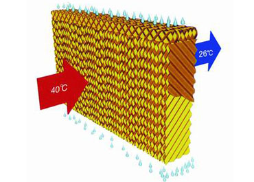 Когда вода проходит через охлаждающую подставку, вода превращается в водяную пленку на поверхности подставки.Водяная пленка обменивается теплом с проходящим воздухом и испаряется в воздух.Принцип испарительного охлаждения заключается в контроле температуры и влажности путем изменения объема увлажнения и размера вентиляции.
